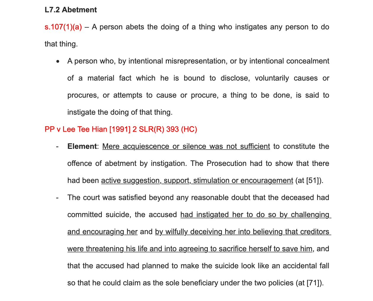 Tip 3: Prepare a case summary list in advance. This saved me a lot of time during exams, as I did not have to dig through stacks of lecture slides or notes to locate that one case hidden in dozens of pages. Aside from creating a table that listed key cases and their legal principles, I also prepared commentaries to help me quickly locate the relevant case law when a question focused on a specific section of an Act. Here is an excerpt from the commentary I prepared for my criminal law exam: